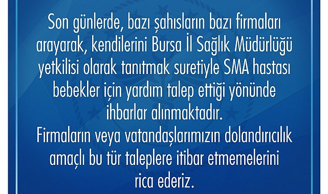 "Son günlerde, bazı şahısların bazı firmaları arayarak, kendilerini Bursa İl Sağlık Müdürlüğü yetkilisi olarak tanıtmak suretiyle SMA hastası bebekler için yardım talep ettiği yönünde ihbarlar alınmaktadır. Firmaların veya vatandaşlarımızın dolandırıcılık amaçlı bu tür taleplere itibar etmemelerini rica ederiz".