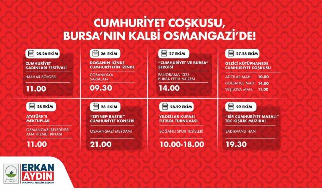 Osmangazi Belediyesi, 29 Ekim Cumhuriyet Bayramı kutlamalarının tüm ilçeyi sarması ve vatandaşların 102'nci yıl coşkusunu doyasıya yaşaması için zengin bir program hazırladı. 25 Ekim Cumartesi günü başlayacak ve 29 Ekim Çarşamba günü son bulacak etkinlikler, Osmangazi'nin dört bir yanında renkli görüntülere sahne olacak. Osmangazi Belediye Başkanı Erkan Aydın'ın yenilikçi anlayışıyla hazırlanan kapsamlı program, ilçede Cumhuriyet ruhuna yeni bir soluk kazandıracak.