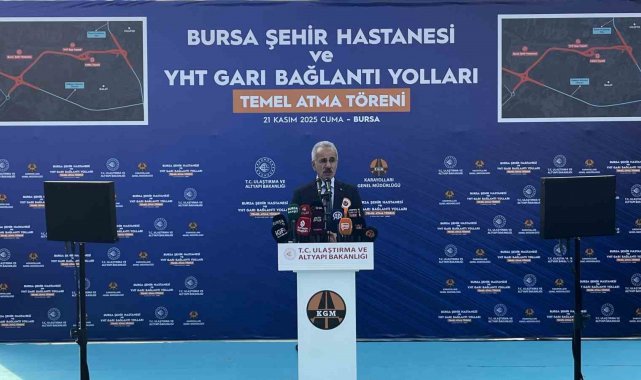 Bursa Şehir Hastanesi ve YHT Garı bağlantı yolları temeli, Ulaştırma ve Altyapı Bakanı Abdulkadir Uraloğlu'nun katılımıyla atıldı. Törende konuşan Bakan Uraloğlu, "Yüksek Hızlı Tren Garı'mıza doğrudan erişim sağlayacak 3 kilometre uzunluğundaki bağlantı yollarımızın temelini atıyoruz. Bursa'nın potansiyelini en üst düzeye çıkararak, ulaşımın her moduyla daha etkin hale getirmek için çalışıyoruz. Bursa, Uludağ'ın eteklerinde, ipek yolu üzerindeki tarihiyle, Ulu Camii ve Yeşil Türbesi ile, sanayisiyle Türkiye'nin önde gelen şehirlerinden biri. Marmara ve Ege Bölgeleri arasında uzanan gelişmiş otoyol ve bölünmüş yol güzergahında geçiş noktası olan şehrimiz her geçen gün büyüyor. Bu sebeple Ulaştırma ve Altyapı Bakanlığı olarak Bursa'nın şehir merkezi, ilçeleri ve çevre illerle ulaşım standardını yeni ulaşım yatırımlarıyla güçlendiriyoruz. Bursa Şehir Hastanemiz, 2019'da hizmete girdiğinden beri milyonlarca hastamıza, vatandaşımıza şifa kapısı oldu. Açılışının ardından hem şehir hastanesine erişim hem de İstanbul-İzmir Otoyolu nedeniyle bu kesimde trafik yoğunluğu giderek arttı. Ayrıca aynı bölgede Bakanlığımız tarafından yapımı sürdürülen Yüksek Hızlı Tren garı ve metro hatlarının merkez istasyonu da bulunuyor. Bu dev yatırımları, birbirine doğrudan ve konforlu bir şekilde bağlanmadıkça tam anlamıyla verimli olamazdı. İşte bugün temelini attığımız 3 kilometrelik bölünmüş yol standardında hizmet verecek bağlantı yolları projemiz tam da bu ihtiyacı karşılıyor. Bağlantı yollarımız tamamlandığında, Bursa Şehir Hastanemize alternatif bir güzergâh sunarak otoyoldaki trafik yükünü azaltacak, acil durumlarda ambulansların ve vatandaşlarımızın hastaneye en hızlı ve en güvenli şekilde ulaşmasını sağlayacak. Yüksek Hızlı Tren garımıza ve metro istasyonuna doğrudan ulaşarak toplu taşıma ile, hareketlilik ve erişilebilirliği arttırarak Bursa'nın bölgesel ulaşım vizyonunu güçlendirecek, artan yolcu ve yük trafiğini daha etkin yöneterek Bursa'nın bölgesel merkez olma gücünü arttıracaktır" dedi.