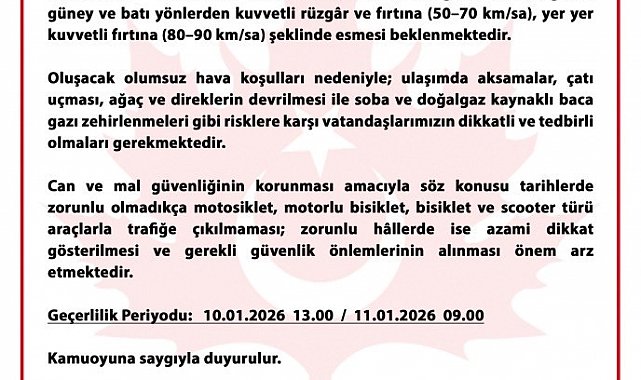 Valilikten yapılan açıklamada, 10-11 Ocak 2026 tarihleri arasında il genelinde rüzgârın 50-70 kilometre/saat hızla kuvvetli rüzgâr ve fırtına şeklinde, yer yer ise 80-90 kilometre/saat hızla kuvvetli fırtına olarak esmesinin beklendiği ifade edildi.
