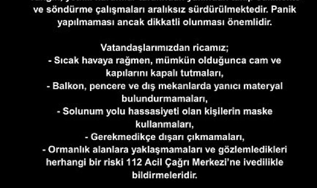 Yapılan açıklamada, "Bilecik'te devam eden Yenişehir ve İnegöl ilçelerimize doğru ilerleyen yangın sebebiyle özellikle rüzgarında etkisiyle kentimizin doğusundaki bazı ilçelerimizde kül yağışı gözlemlenmektedir. Yangın yetkili kurumlar tarafından yakından takip edilmekte söndürme çalışmaları aralıksız devam etmektedir. Panik yapılmaması ancak dikkatli olunması önemlidir. Vatandaşlarımızdan ricamız sıcak havaya rağmen cam ve kapılarını kapalı tutmaları. Balkon pencere ve dış mekanlarda yanıcı materyal bulundurmamaları. Solunum yolu hassasiyeti olan vatandaşlarımızın maske kullanmaları. Gerekmedikçe dışarıya çıkmamaları, ormanlık alanlara girmemeleri, gözlemledikleri herhangi bir riski 112 acil çağrı merkezine bildirmeleridir" ifadelerine yer verildi.
