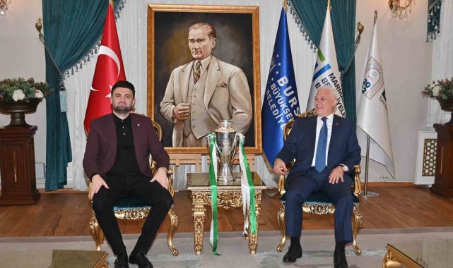 Bursa Büyükşehir Belediye Başkanı Mustafa Bozbey, şampiyonluk kupasıyla kendisini ziyaret eden Bursaspor Başkanı Enes Çelik ve yönetim kurulu üyelerini ağırladı. Bursaspor'un her zaman maddi ve manevi yanında olduklarını ve olmaya devam edeceklerini belirten Başkan Bozbey, "Seneye de aynı şekilde Bursaspor'un başarılı olacağına inanıyoruz. Hedef Süper Lig" dedi.