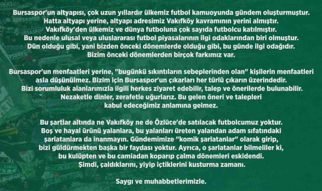 Bursaspor Kulübü, "Şarlatanlara inanmayın" diyerek yaptığı açıklamada, "Vakıfköy'den ve Özlüce'den satılık futbolcumuz yoktur" ifadelerini kullandı. Bursaspor Kulübü, 'Geleceğimizi Satamazsınız' başlıklı yaptığı açıklamada şu ifadelere yer verdi: "Bursaspor'un altyapısı, çok uzun yıllardır ülkemiz futbol kamuoyunda gündem oluşturmuştur. Hatta altyapı yerine, altyapı adresimiz Vakıfköy kavramının yerini almıştır. Vakıfköy'den ülkemiz ve dünya futboluna çok sayıda futbolcu katılmıştır. Bu nedenle ulusal veya uluslararası futbol piyasalarının ilgi odaklarından biri olmuştur. Dün olduğu gibi, yani bizden önceki dönemlerde olduğu gibi, bu günde ilgi odağıdır. Bizim önceki dönemlerden birçok farkımız var. Değerli Bursasporlular, Bursaspor'un menfaatleri yerine, 'bugünkü sıkıntıların sebeplerinden olan' kişilerin menfaatleri asla düşünülmez. Bizim için Bursaspor'un çıkarları her türlü çıkarın üzerindedir. Bizi sorumluluk alanlarımızla ilgili herkes ziyaret edebilir, talep ve önerilerde bulunabilir. Nezaketle dinler, zarafetle uğurlarız. Bu gelen öneri ve talepleri kabul edeceğimiz anlamına gelmez. Bu şartlar altında ne Vakıfköy ne de Özlüce'de satılacak futbolcumuz yoktur. Boş ve hayal ürünü yalanlara, bu yalanları üreten yalandan adam sıfatındaki şarlatanlara da inanmayın. Gündemimize 'komik şarlatanlar' olarak girip, bizi güldürmekten başka bir faydası yoktur. Ayrıca, o şarlatanlar bilmeliler ki, bu kulüpten ve bu camiadan koparıp çalma dönemleri eskidendi. Şimdi, çaldıklarını, yiyip içtiklerini kusturma zamanı. Saygı ve muhabbetlerimizle. Bursaspor Kulübü Yönetim Kurulu."
