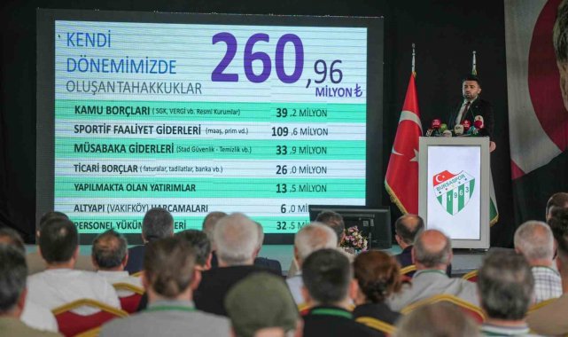 Bursaspor Başkanı Enes Çelik, Merinos Atatürk Kongre ve Kültür Merkezi'nde gerçekleştirilen Olağan Mali ve İdari Genel Kurulu'nda Bursaspor'un kalan ve ödenen borçları açıkladı. Kongrede konuşan Çelik, kulübün toplam borcunun 2.1 milyardan, 1.1 milyara düştüğünü söyledi.
