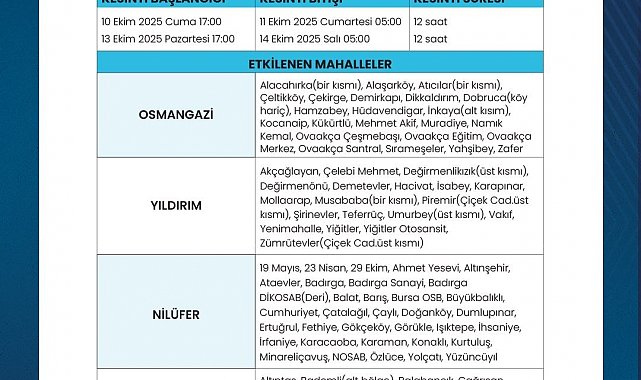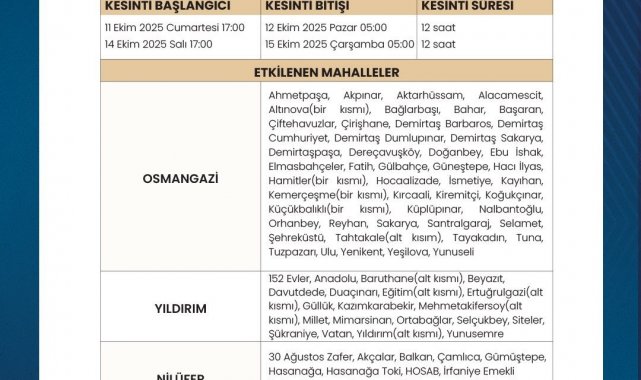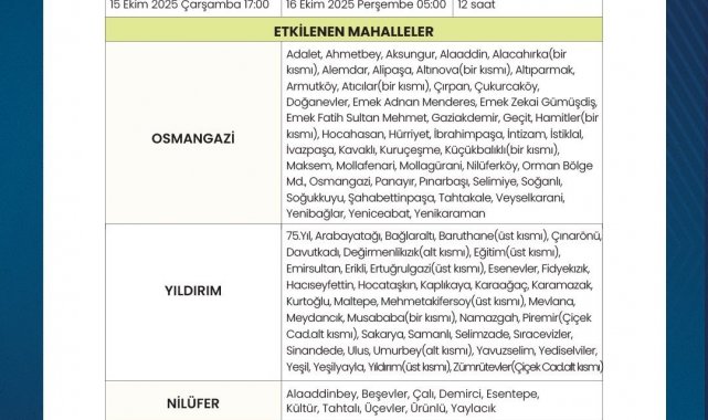 Söz konusu planlı su kesintileri, günlük 12 saati geçmemek kaydıyla, merkez ilçelere bağlı mahallelerde dönüşümlü olarak uygulanacaktır. Yapılması planlanan su kesintileri ile günlük 100 bin metreküp su tasarrufu yapılması hedeflenmektedir. Planlı su kesintilerinden Uludağ Üniversitesi, Şehir Hastanesi ve Devlet Hastaneleri etkilenmeyecektir.