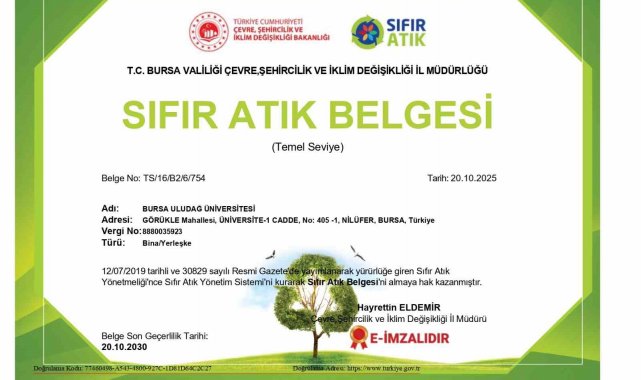 Çevre, Şehircilik ve İklim Değişikliği İl Müdürlüğü tarafından yapılan değerlendirmeler sonucunda; üniversitenin 20 Ekim 2025 tarihinde süresi dolan "Sıfır Atık Belgesi", proje gerekliliklerinin başarıyla yerine getirilmesiyle 20 Ekim 2030 tarihine kadar yenilendi. Yenilenen belge; BUÜ Atık Yönetim Merkezi tarafından BUÜ Rektörü Prof. Dr. Ferudun Yılmaz, Rektör Yardımcısı Prof. Dr. Cafer Çiftçi ve Genel Sekreter Mehmet Aydemir'e takdim edildi. Yapılan görüşmede, doğal kaynakların verimli kullanımı ve atık geri kazanımı konularında yürütülen projeler hakkında bilgi verildi. Rektör Prof. Dr. Ferudun Yılmaz, süreci başarıyla yürüten Atık Yönetim Merkezi'ne emeklerinden dolayı teşekkür etti.