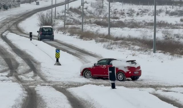 Büyükçekmece'de etkili olan kar yağışının ardından sürücüler ilerlemekte güçlük çekerken, bir araç yoldan çıktı. O anlar cep telefonu kamerasına yansıdı.