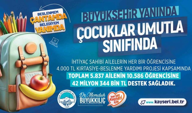 Öğrenci ve genç dostu hizmetleri ile gönüllere dokunarak Cumhurbaşkanı Recep Tayyip Erdoğan'ın elinden Genç Dostu Şehir Ödülü'nü alan Kayseri Büyükşehir Belediye Başkanı Dr. Memduh Büyükkılıç, eğitime ve öğrencilere güçlü desteğini sürdürüyor. Bu kapsamda Büyükşehir Belediyesi tarafından geçtiğimiz eğitim-öğretim yıllarında kırtasiye desteği olarak hayata geçirilen proje, 2025-2026 eğitim öğretim yılında da Başkan Büyükkılıç'ın talimatlarıyla 'beslenmem çantamda, belediyem yanımda' sloganı ile beslenme ve kırtasiye desteği olarak uygulandı.