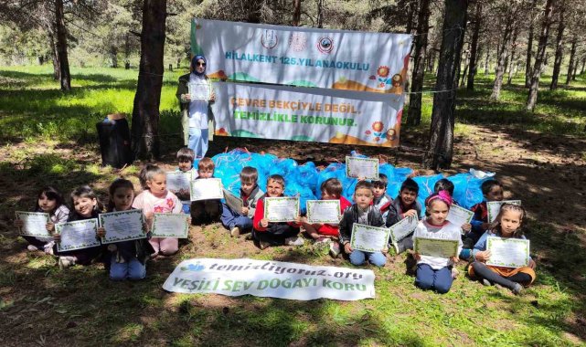 Erzurum'un Yakutiye ilçesi Hilalkent 125. Yıl Anaokulu öğrencileri, herkese örnek olacak bir çevre faaliyeti yaptı. Anaokulu çocukları 8 yıldır gönüllü olarak doğa temizliği yapan A.Kerim Erzeneoğlu ve öğretmenlerinin denetiminde onlarca poşet çöp topladı. Atatürk Üniversitesi kampüsü içinde bulunan ormanlık alanda, önce ellerine eldivenleri takan minikler daha sonra adeta bir oyun oynar gibi çevredeki çöpleri topladılar. Çöp toplama konusunda yarışa giren minikler kısa sürede onlarca poşete çöpleri doldurdular.