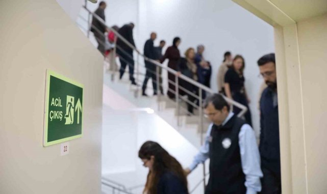 Afet ve Koordinasyon Merkezi (AKOM) koordinesinde yapılan tatbikat kapsamında senaryo gereği yaşanan acil bir durum sonrası bina hızlı ve güvenli bir şekilde boşaltıldı. AKOM'dan 15 kişilik uzman ekibin de katıldığı tatbikatta, hem personelin hem de binada bulunan vatandaşların güvenli şekilde tahliyesi sağlandı.