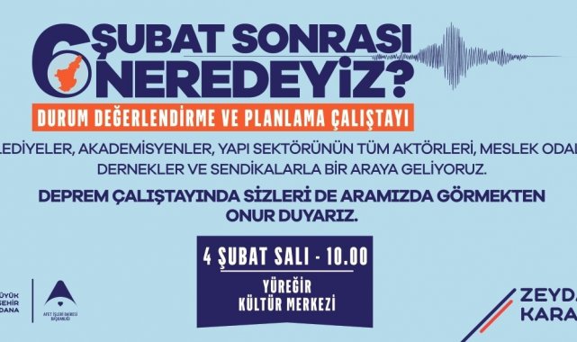 Adana Büyükşehir Belediyesi, 6 Şubat depremlerinin yıldönümü nedeniyle "Deprem Çalıştayı" düzenleyecek. 6 Şubat Sonrası Neredeyiz? Durum Değerlendirme ve Planlama Çalıştayı ile Sonuç Raporu ve Deprem Değerlendirme Forumu 4 Şubat Salı günü gerçekleştirilecek.