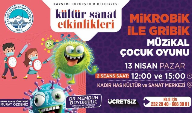Minikler için de 13 Nisan Pazar günü saat 12.00 ve 15.00'te 2 seans olarak eğlence dolu bir etkinlik hazırlayan Büyükşehir, Kadir Has Kültür ve Sanat Merkezi'nde Genel Sanat Yönetmeni Murat Özdeniz yönetmenliğinde düzenlenecek Mikrobik ve Gribik Müzikal Çocuk Oyunu ile miniklere unutulmaz bir deneyim yaşatacak.