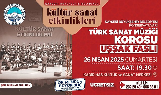 Kayseri Büyükşehir Belediyesi, Türk Sanat Müziği tutkunlarını unutulmaz bir geceye davet ediyor. 26 Nisan'da gerçekleşecek 'Uşşak Faslı' konseri, ücretsiz olarak müzikseverlerle buluşacak.