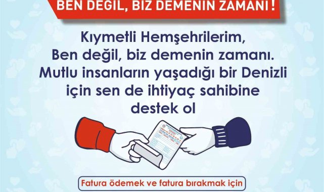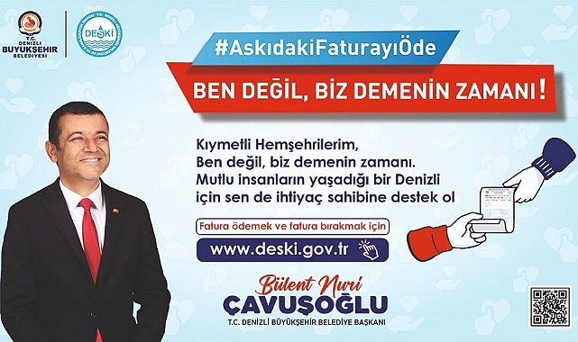 Denizli Büyükşehir Belediye Başkanı Bülent Nuri Çavuşoğlu'nun talimatı doğrultusunda başlatılan "Askıda Fatura" uygulaması, sosyal yardım alan ihtiyaç sahibi vatandaşlar ile yardımseverleri bir araya getiriyor. "Ben değil, biz demenin zamanı. Mutlu insanların yaşadığı bir Denizli için sen de ihtiyaç sahibine destek ol" sloganıyla duyurulan kampanya, şeffaflık ve gizlilik ilkesiyle dikkat çekiyor. Kampanya kapsamında yardımı yapan ve alan kişi birbirini bilmeyecek, böylece toplumsal dayanışmanın en hassas şekilde sağlanacağı ifade edildi.