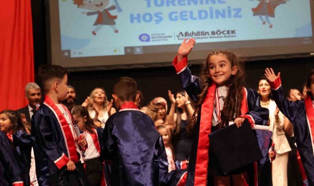 Antalya Büyükşehir Belediyesi bünyesinde hizmet veren kreş ve gündüz bakımevlerinde eğitim gören çocuklara özel yıl sonu mezuniyet töreni düzenlendi. Program sonunda diplomalarını alan minikler, kep fırlatarak mezuniyetlerini kutladı.