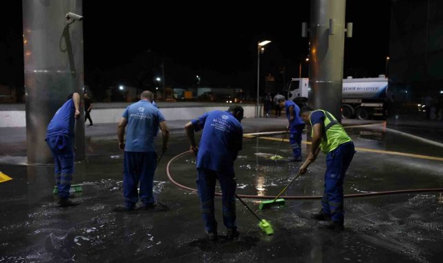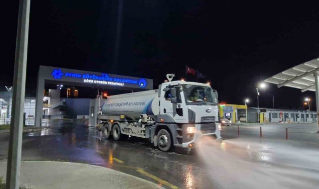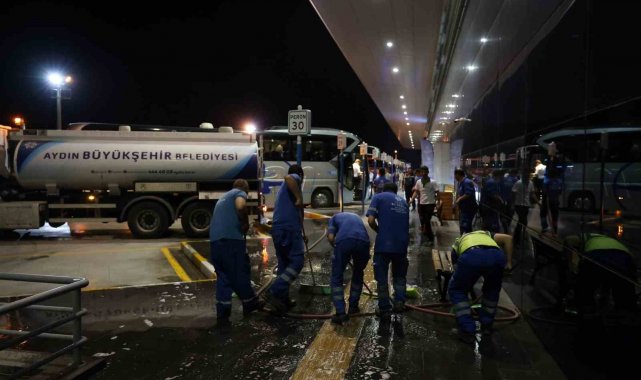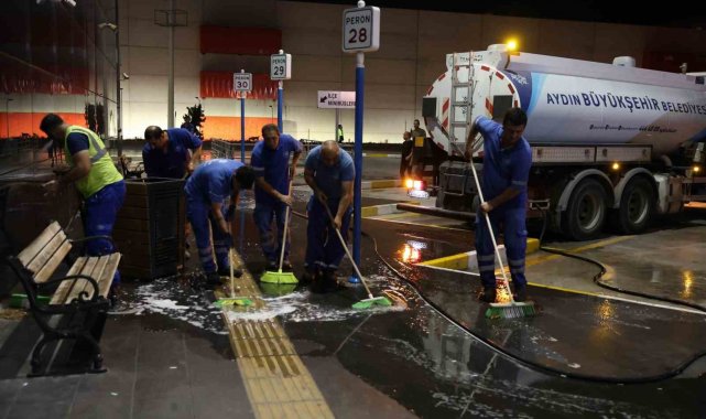 Bayram tatilini geçirmek üzere turizmin ve tarihin kenti Aydın'a gelen vatandaşların yoğunluk oluşturduğu otogarlarda gece saatlerinde temizlik çalışması gerçekleştirildi. Büyükşehir Belediyesi Çevre Koruma ve Kontrol Dairesi Başkanlığı ekipleri tarafından gerçekleştirilen temizlik çalışması kapsamında Şehirler Arası Otobüs Terminali temiz hale geldi.
