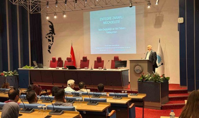 Öğretim Üyesi Çağlar, iklim değişikliği nedeniyle zararlı türlerin gerek farklı türlerde gerekse artış şeklinde karşılarına çıktığına işaret ederek bunlarla mücadele noktasında ne gibi uygulamalar yaptıkları ve nasıl bir yol izlediklerine dair katılımcıları ayrıntılı olarak bilgilendirdi.