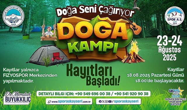 Kayseri Büyükşehir Belediyesi, Spor A.Ş. tarafından düzenlenen ve her yıl "Doğa Seni Çağırıyor" sloganıyla geleneksel hale gelen doğa kampı, dolu dolu devam ediyor. Sarımsaklı Barajı'nda gerçekleştirilen etkinlik, doğaseverlerin yoğun ilgisi ile geçti. Gelecek haftanın kayıtları da devam ediyor.