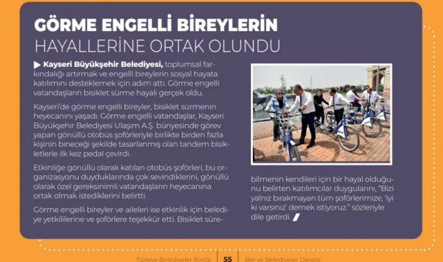 Recep Tayyip Erdoğan Millet Bahçesi'nde görme engelli vatandaşların bisiklet sürme hayalini gerçeğe dönüştüren Kayseri Büyükşehir Belediyesi, ilk kez bisiklet deneyimi yaşayan görme engelli bireylerin sevincine ortak olmuştu. Söz konusu farkındalık, Türkiye Belediyeler Birliği (TBB) süreli yayını olan İller&Belediyeler Dergisi'nde de yer buldu.