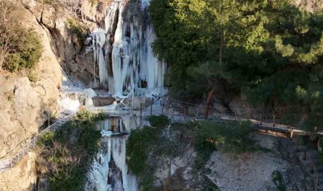 Afyonkarahisar'ın Dinar ilçesinde kısmı bir şekilde donan Suçıkan Şelalesi buz sarkıtları eşliğinde akan suları ile görsel şölen oluşturdu.