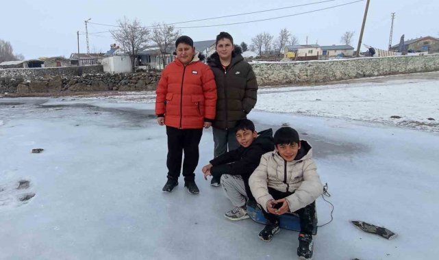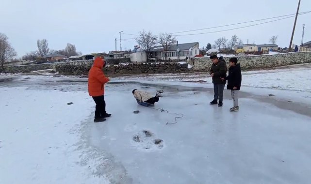 Kars'ın Akyaka ilçesinde buz tutan derede kızakla kayan çocuklar sömestir tatilinin keyfini çıkarıyor.