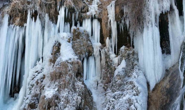 Şelalede uzunluğu 2 metreyi bulan buz sarkıtları, kartpostallık görüntüler oluşturdu.