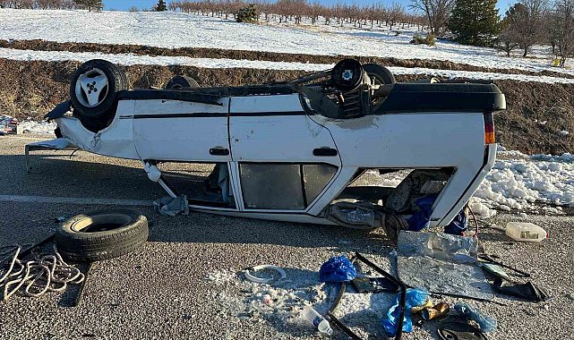 Konya'nın Bozkır ilçesinde buzlanma nedeniyle takla atan otomobilde sürücü kazayı yara almadan atlattı.