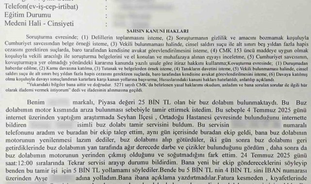 Merkez Sarıçam ilçesi Çarkıpare Mahallesi'nde oturan Kahraman Murat Denizli, buzdolabının arızalanması üzerine 4 Temmuz'da internetten bulduğu bir teknik servise kayıt oluşturdu. Teknik servis elemanları ise geldiğinde, 'buzdolabının motoru arızalanmış, 5 bin liraya tamir ederiz' dedi. Bunun üzerine Denizli, teknik servise dolabını gönderdi. Birkaç gün sonra dolap geldiğinde arızanın devam ettiğini fark eden Denizli, yeniden teknik servisi çağırdı.