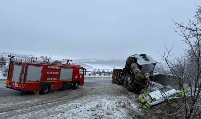 Çorum'un Sungurlu ilçesinde buzlanma sebebiyle devrilen tırın sürücüsü yaralandı.