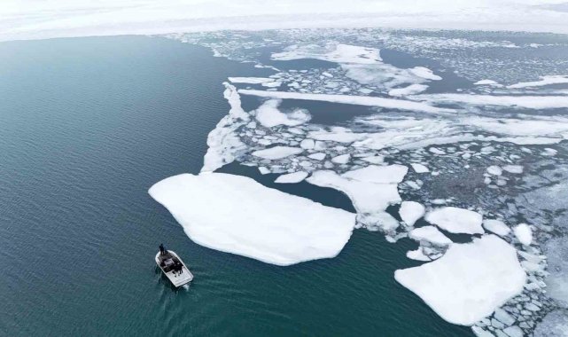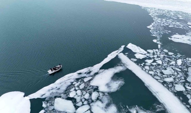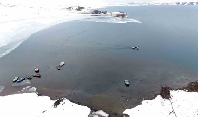 Bitlis'in Ahlat ilçesinde kış mevsiminde dondurucu soğuk nedeniyle yüzeyi buz tutan Nazik Gölü'nün çözülmeye başlamasıyla balıkçı tekneleri avlanmak için göle açılmaya başladı.