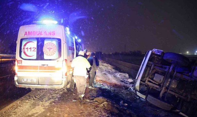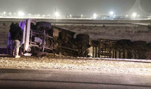 Aksaray'da buzlanan karayolunda kayan tır kontrolden çıkarak şarampole devrildi, kazada sürücü yaralandı.