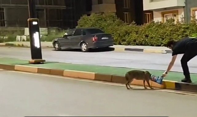 Karabük'te başına poşet takılan ve refüjde çaresizce bekleyen bir çakal, yoldan geçen üniversite öğretim görevlisinin müdahalesiyle kurtarıldı.