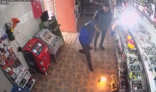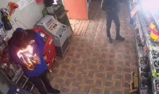Olay, bir oto elektrik dükkanında meydana geldi. Edinilen bilgiye göre, dükkanda çalışan bir işçi, kabloyu eritmek için çakmağı çakınca o sırada elinde bulunan yapıştırıcı sprey bir anda alev aldı. Yüzü kısa süreliğine alevler arasında kalan çalışan, sprey kutusunu yere attı. Kısa bir şokun ardından kendine gelen çalışan, yerde yanan sprey kutusunu alarak dışarı attı. O anlar kameralara yansıdı.