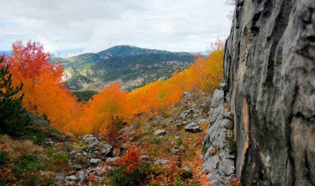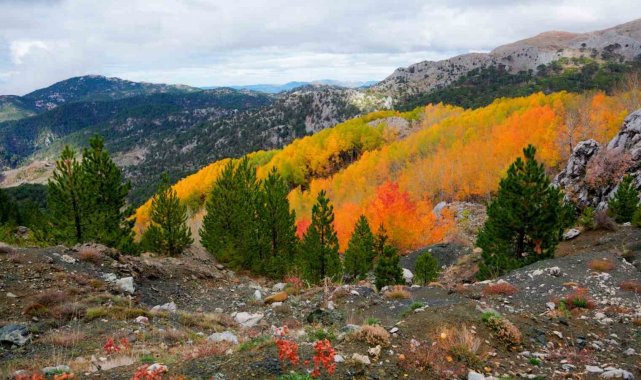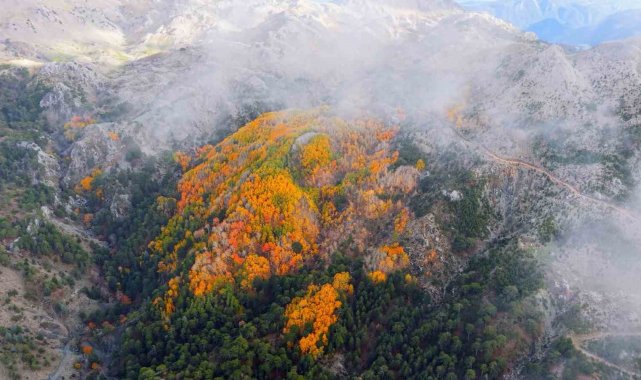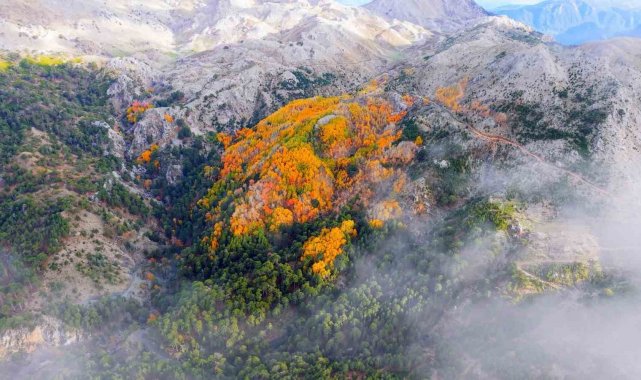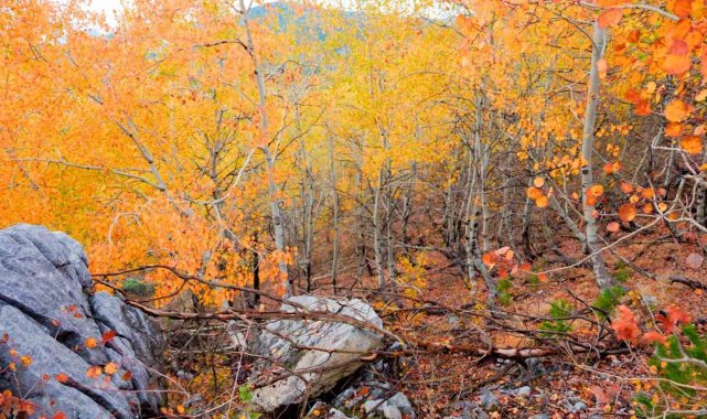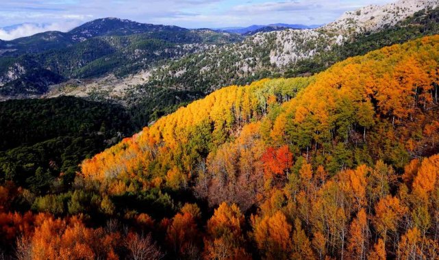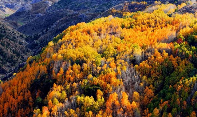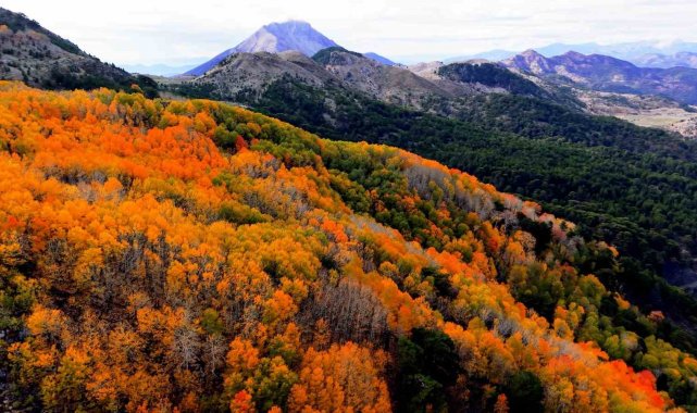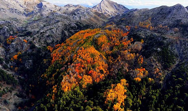 Denizli'nin Çameli ilçesi, zengin florası ve yüksek endemik tür çeşitliliğiyle dikkat çekiyor. İlçenin önemli doğal alanlarından biri olan titrek kavak ormanları ise özellikle ziyaretçilerine görsel bir şölen sunuyor. Sarı, kızıl, turuncu ve yeşilin tonlarıyla oluşan renk cümbüşü havadan görüntülendi.