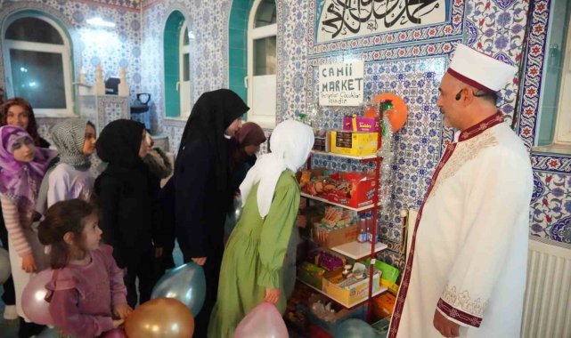 "Cami Market" uygulamasıyla namazlara gelen çocuklara ikramlarda bulunuluyor, oyunlar oynanıyor.