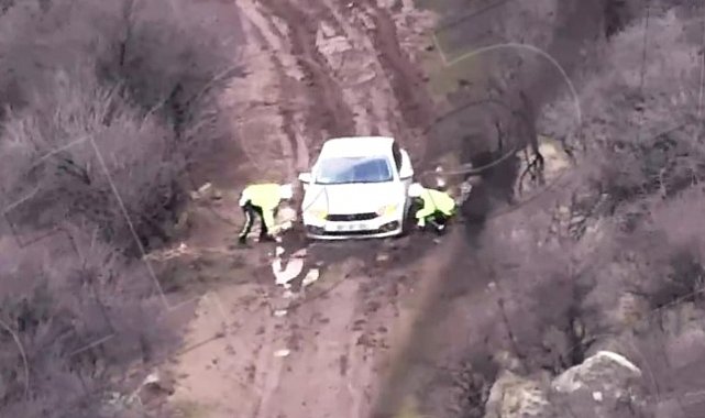 Otomobil, 2 polisin yaklaşık 15 dakika süren çalışmasının ardından saplandığı çamurdan çıkarıldı.