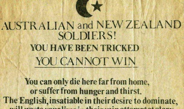 Çanakkale Kara Savaşları sırasında İngilizler, Türk askerlerine ele geçirdikleri esirlere iyi muamele yaptıklarını, onların yemeklerinin, giyim kuşamlarının iyi olduğunu belirterek, aslında düşmanlarının Türkler olmadığı, düşmanlarının Almanlar olduğu vurgusu yapan broşürler attı. Broşürlerde, İngilizlerin Türk askerlerine, "Bizim düşmanımız sizler değilsiniz, düşmanımız Almanlar. Biz aslında halifeliğe, padişaha ve sizlere saygı duyuyoruz. Sadece düşmanımız olan Almanlarla yan yana bulunmamanız gerekiyor. Onun için de gelin Türkler bize teslim olun ya da Almanlarla iş birliği yapmayı bırakın" ifadeleri yer aldı.