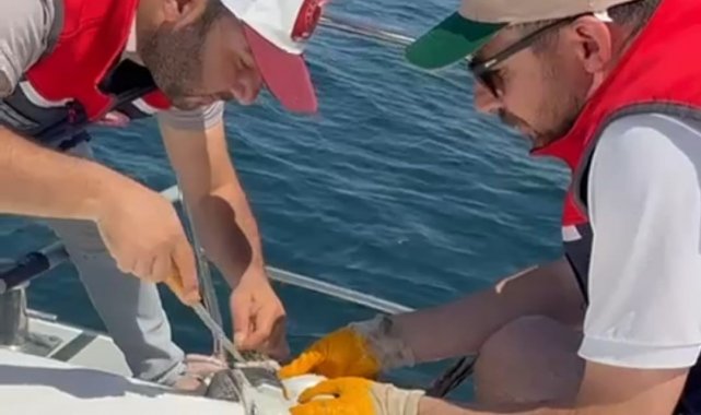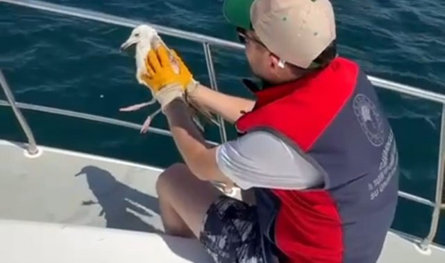 Çanakkale'de İl Tarım ve Orman Müdürlüğü Su Ürünleri Kontrol ekiplerince deniz denetimi gerçekleştirildiği sırada ucunda balık bulunan oltaya takılı martı zarar görmeden kurtarılarak doğaya salındı.