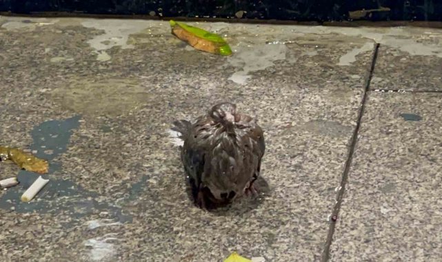 Yağan dolu yağışı nedeniyle bir kuş bitkin düştü