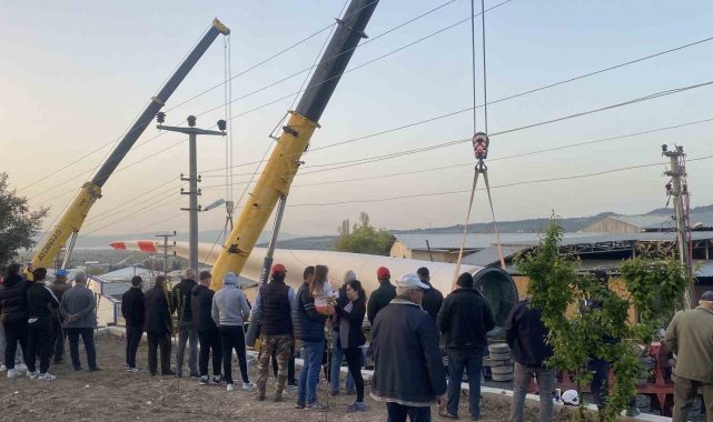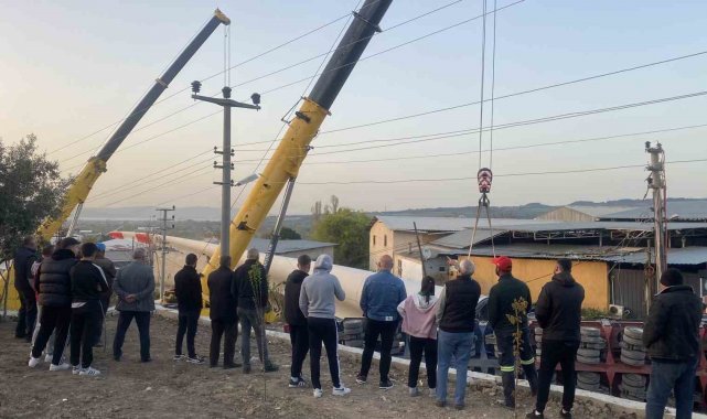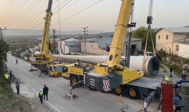 Rüzgar gülü kanadının kaldırılması için çalışma başlatıldı. Bölgeye gelen 2 büyük vinç ile rüzgar gülü kanadı halatla bağlandı. Yaklaşık 9 saat süren çalışmanın ardından rüzgar gülü kanadı, fabrika ile dam üzerinden kaldırıldı. Rüzgar gülü kanadı ile devrilen tırın yoldan kaldırılmasından yol trafiğe açılacak.