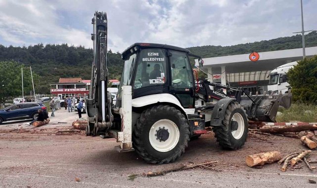 Yola savrulan tomruklar ise Ezine Belediyesi ekipleri tarafından yoldan kaldırılıyor.