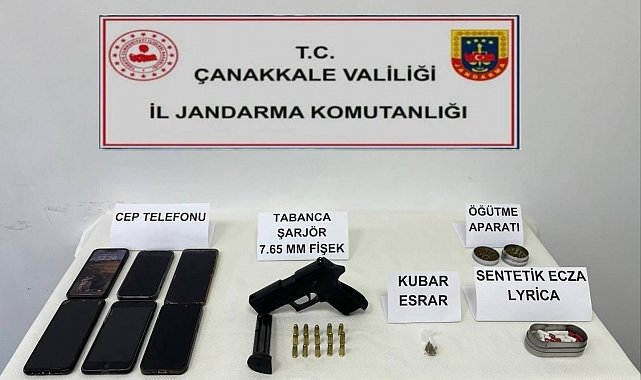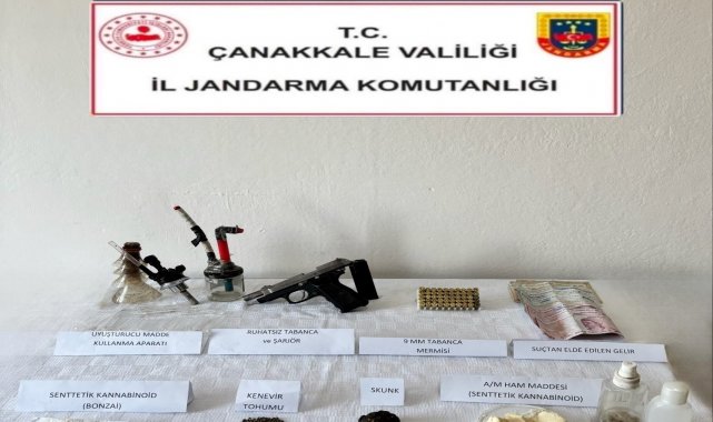 Çanakkale Cumhuriyet Başsavcılığı koordinesinde, İl Jandarma Komutanlığı ekiplerince uyuşturucu ve uyarıcı madde ile mücadele çerçevesinde 5-17 Kasım tarihleri arasında il merkezi ve ilçelerde, 17 şüpheliye ait 11 adrese operasyon gerçekleştirildi. Yapılan aramalarda 36 gram kubar esrar, 35 gram sentetik kannabinoid hammadde, 17 gram sentetik kannabinoid, 10 gram skunk, 10 gram kenevir tohumu, 10 adet sentetik ecza, 2 adet ruhsatsız 9 milimetre tabanca, ruhsatsız 7.65 milimetre tabanca, 65 adet 9 milimetre ve 15 adet 7.65 milimetre tabanca fişeği, uyuşturucu öğütme aparatı, 3 adet uyuşturucu kullanma aparatı (payp), 29 adet uyuşturucu kullanma aparatı (kova), 6 adet cep telefonu, 3 bin 200 TL suç geliri para ele geçirildi. Operasyonlarda gözaltına alınan 17 şüpheliden 1'i çıkarıldığı mahkemece tutuklanarak cezaevine sevk edildi.