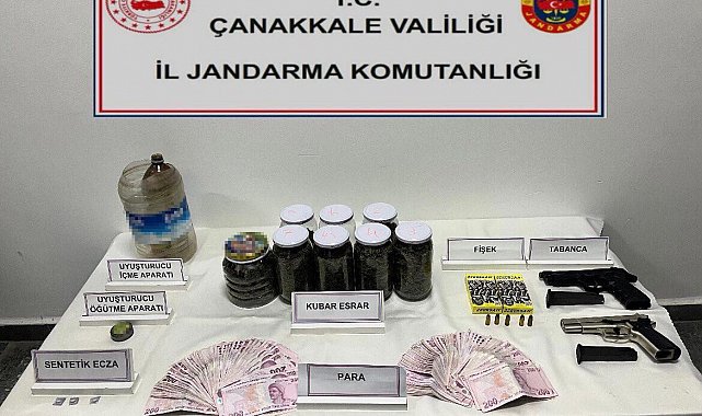 Çanakkale Cumhuriyet Başsavcılığı koordinesinde, Çanakkale İl Jandarma Komutanlığı tarafından Uyuşturucu veya Uyarıcı Madde İmal ve Ticareti, Uyuşturucu Madde Bulundurmak ve Kullanmak suçlarını işlediği tespit edilen şüphelilere yönelik Biga ilçesinde operasyon düzenlendi. Operasyonda yapılan aramalarda, 900 gram kubar esrar, 3 adet sentetik ecza, kurusıkı tabanca, kurusıkıdan bozma 9 mm çapında tabanca, 109 adet kurusıkı tabanca fişeği, 5 adet 9 mm çapında fişek, uyuşturucu öğütme aparatı, uyuşturucu kullanma aparatı, 33 bin 680 TL suçtan elde edilen gelir olduğu değerlendirilen para ele geçirildi.