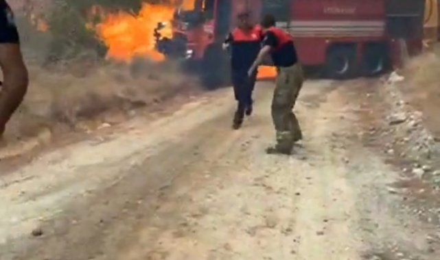 Çanakkale'de öğle saatlerinden itibaren süren yangında bir itfaiye ekibi alevlerin arasında kaldı. Alevlerin itfaiye aracının üzerine gelmesiyle ekipler canını zor kurtardı. O anlar saniye saniye kaydedilirken yanan itfaiye aracı küle döndü.