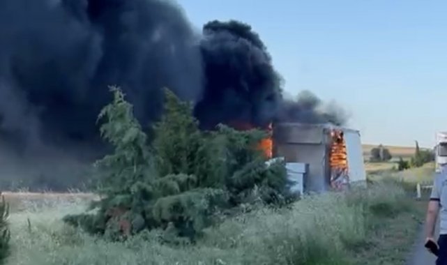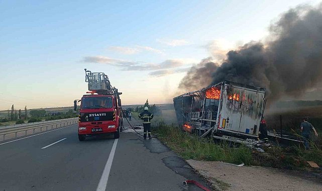 Çanakkale'de yol kenarına devrilen tır alev alev yandı