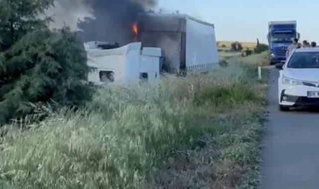 Çanakkale'de kontrolden çıkarak yol kenarına devrilen tır alev alev yandı. Kazada hafif yaralanan sürücünün alkollü olduğu tespit edildi.