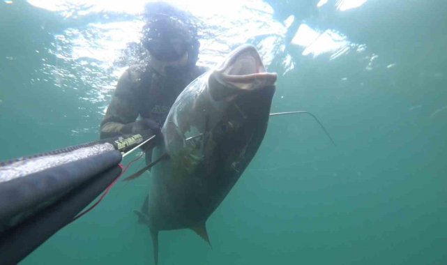 Yaklaşık 1 saat süren mücadele sonrası Doğan, akyayı kıyıya çıkardı. Balığı zıpkınla avlayan Doğan, bu anları da su altı kamerasıyla saniye saniye kaydetti.