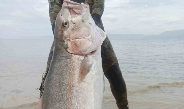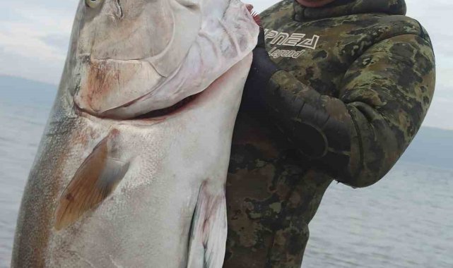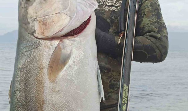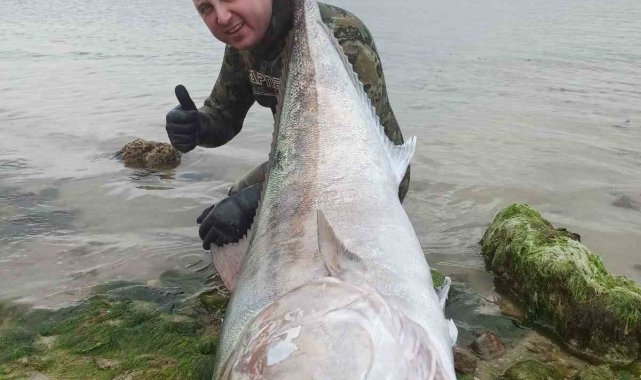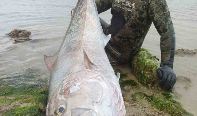 Çanakkale'de zıpkınla 1.8 metre boyunda 63 kilogram akya balığı avladı
