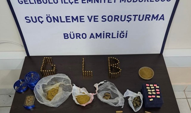 Gelibolu ilçe Emniyet Müdürlüğü Suç Önleme ve Soruşturma Büro Amirliği ekipleri uyuşturucu madde satışına yönelik çalışma çerçevesinde şüpheli Ç. Ş. üzerinde yapılan aramada uyuşturucu madde ele geçirdi. Şüphelinin ikametinde yapılan aramada 4.08 gram kubar esrar, 24.62 gram esrar, 15.8 gram skunk, 18.67 gram toz esrar, 16 extacy hap, 100 adet 9.9 mm fişek ele geçirildi. İkamette yapılan arama sırasında T.A. (39) ve B.K. (30) gözaltına alındı.