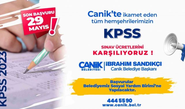 Canik Belediyesi tarafından yapılan açıklamada, Canik'te ikamet eden ve 2023 yılı KPSS başvuru desteği almak isteyen vatandaşların 29 Mayıs 2023 tarihine kadar Canik Belediyesi Sosyal Yardım Birimi'ne, banka ücret dekontu ve 2023 KPSS sınav kayıt belgesi ile birlikte başvuruda bulunması gerektiği belirtildi. Vatandaşların, 2023 yılı KPSS başvuru desteği hakkında detaylı bilgiye belediyenin 444 55 90 numaralı çağrı merkezi üzerinden, 459 veya 460 dâhili hatlarından ulaşabileceği kaydedildi.